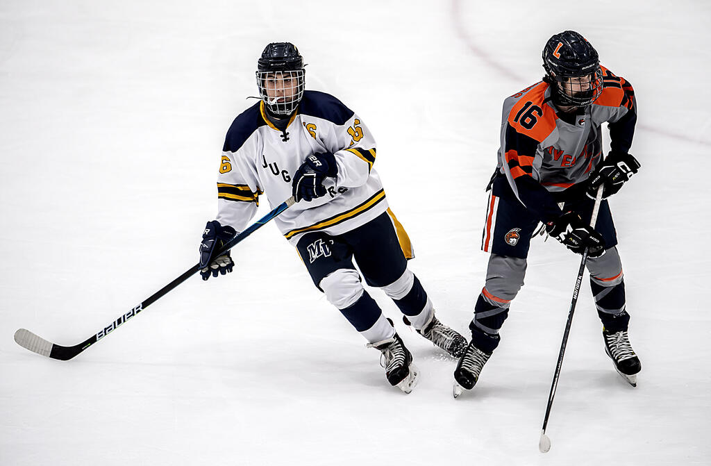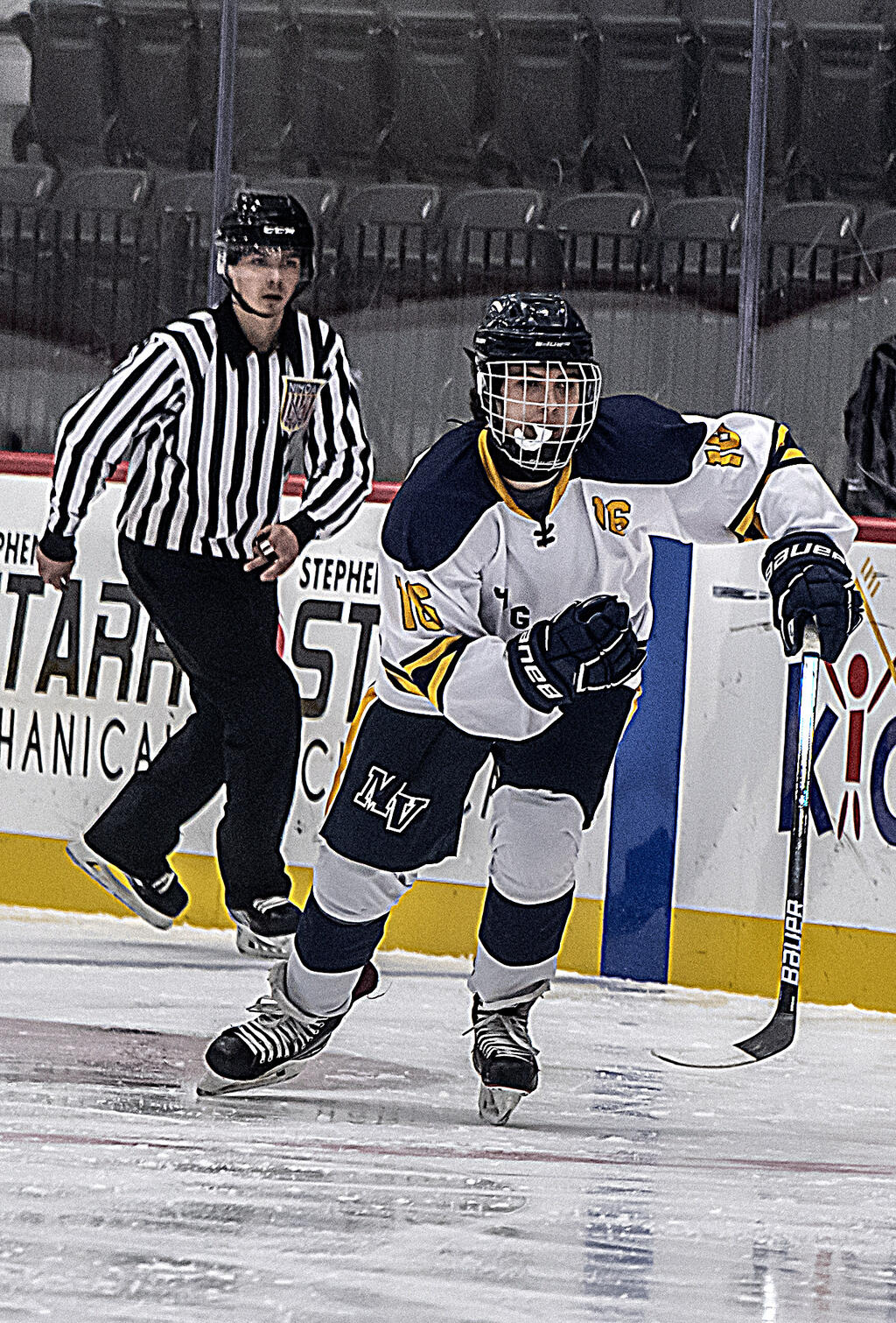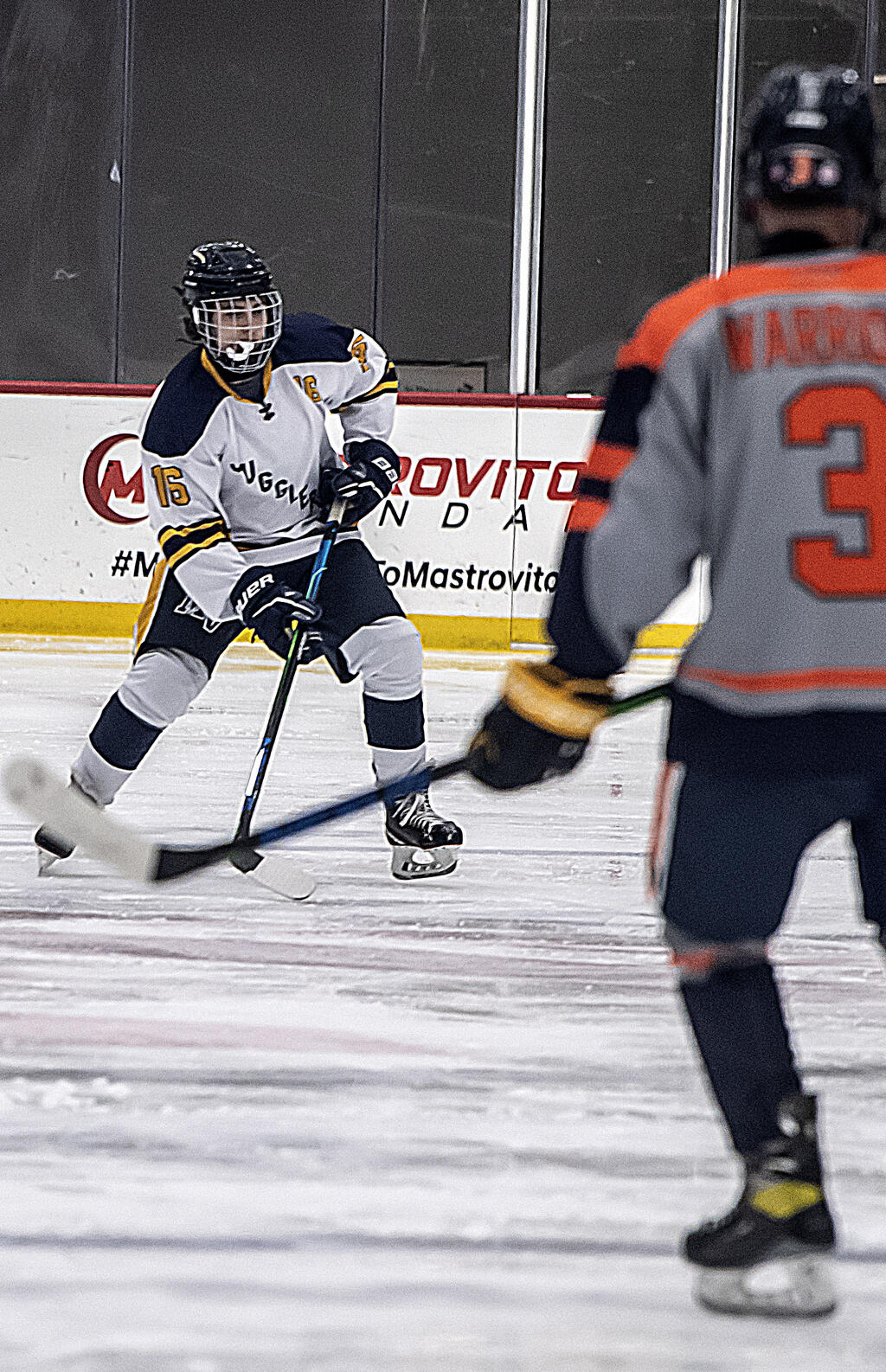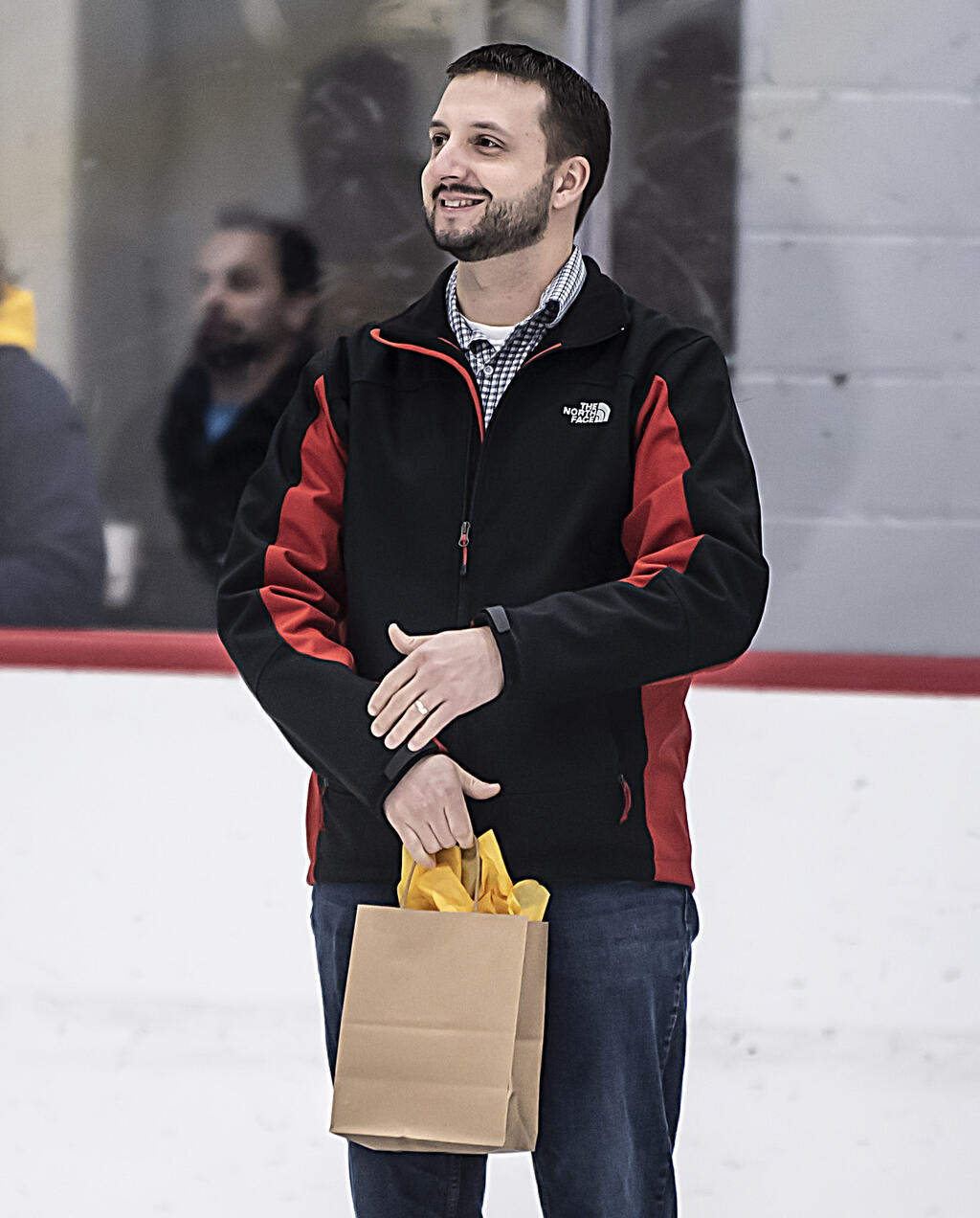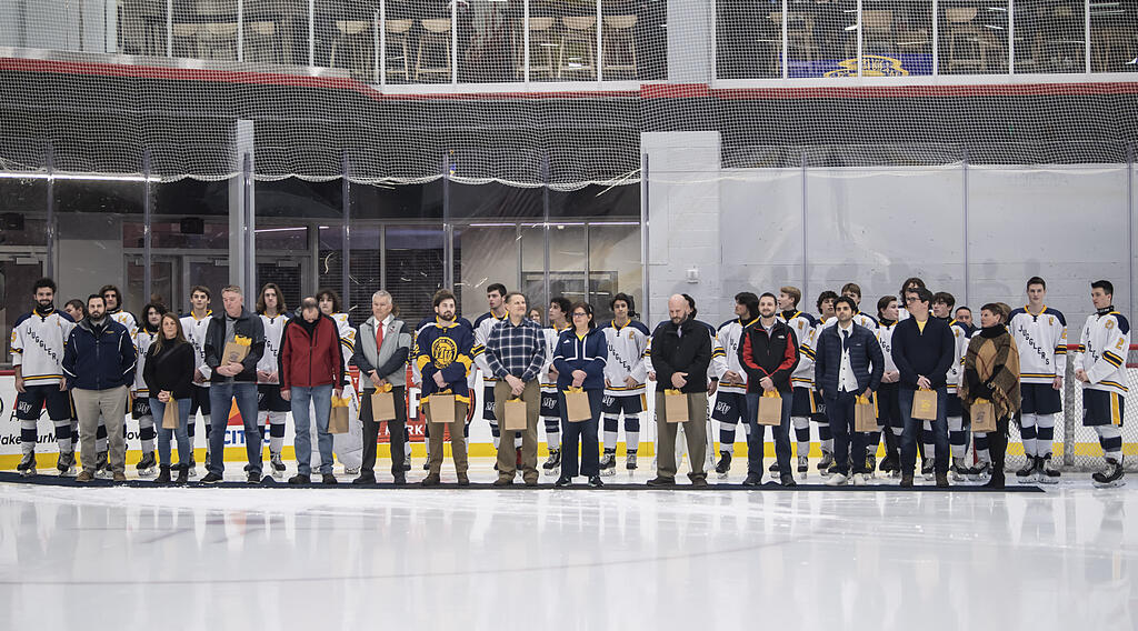 प्रोक्टर भर्सिटी हकी खेलाडीहरू # 16 निक माजा र # 19 मोहक भ्याली जुगलर्सका काइल म्याकरेनोल्ड्सले नेक्सस सेन्टरमा शिक्षक प्रशंसा नाइटको समयमा प्रोक्टर्स एलीशा अब्बेलाई प्रशंसा गरे।